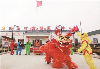 伴隨著鑼鼓鏗鏘聲,領(lǐng)獅人不時(shí)做出空翻、側(cè)翻等高難度動(dòng)作,手中的繡球上下翻飛,惟妙惟肖的獅子撲、跌、翻滾、跳躍。在大周鎮(zhèn)路莊村新建成的村部內(nèi),精彩的少兒舞獅表演引得現(xiàn)場掌聲陣陣。