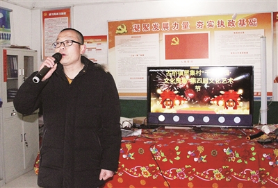 “去年俺唱了一首《駝鈴》后,就成了俺村的‘民星’。這不,兩個(gè)月前,紅亮叔就給俺打招呼,讓俺今年還得唱。”賈二猛笑著說。他口中的“紅亮叔”是賈集村村委委員、文化協(xié)管員賈紅亮。“俺賈集文化底蘊(yùn)深厚,村民有喜歡吹嗩吶的,有愛好唱戲曲的,有熱衷跳廣場舞的,有擅長寫書法的。村‘兩委’琢磨著咋把這些文化資源整合起來,于是就想到了辦‘村晚’,并向村民發(fā)出了‘賈集大舞臺(tái),有才你就來’的節(jié)目招募通知。”賈紅亮告訴記者。