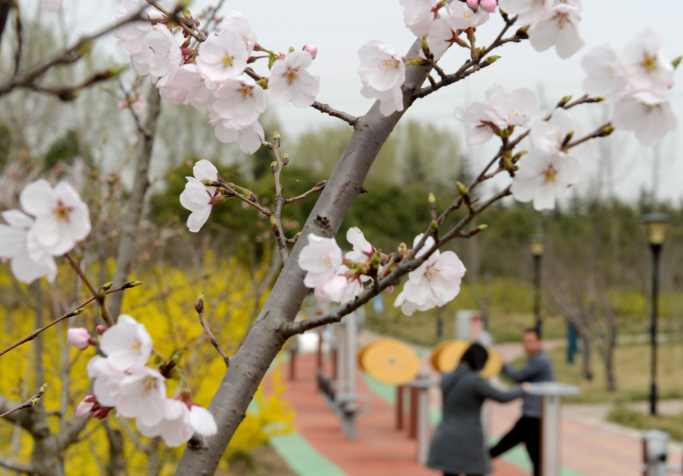 櫻花游園內,人們一邊健身,一邊欣賞櫻花。