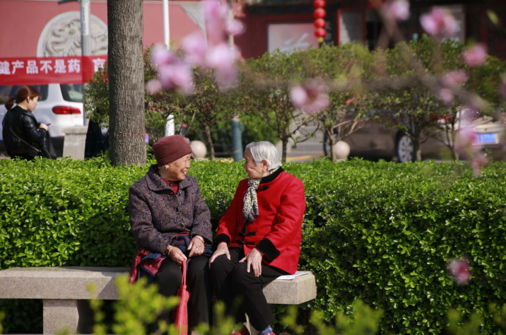 春暖花開,陽光和煦,兩位老人在廣場上坐著閑聊,平和、安逸的幸福感溢出了畫面。 晨報攝友 田樺 攝