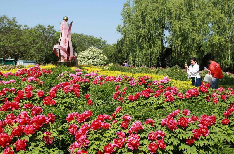 4月20日,在中原花木博覽園,進入盛花期的牡丹花,豐姿典雅,花香襲人,吸引不少游客前來賞玩。