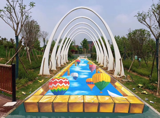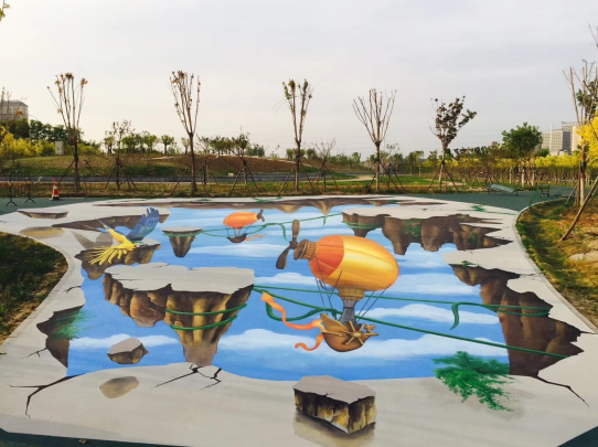 手繪3D景觀是直接以地面為載體進行繪畫創作的。它以地面為媒介,利用平面透視的原理制造出視覺上的虛擬立體效果,令參觀者有一種身臨其境的感覺。手繪3D景觀中的景物立體、細膩、逼真,往往達到以假亂真的藝術效果。