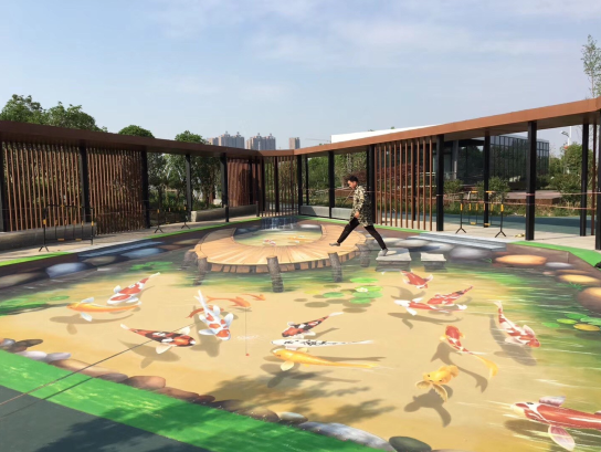 記者注意到,最后一處手繪3D景觀“荷塘月色”已經進入收尾階段:在開闊的地面上,可以看到一方“荷塘”,活靈活現的“游魚”和碧綠的“荷葉”清晰可見,畫面非常生動。