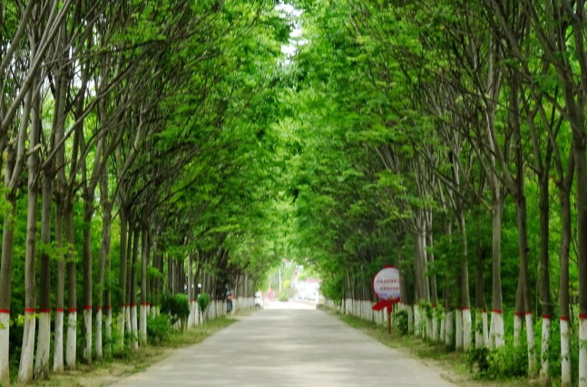 鄢陵縣春暉大道北側立著一塊大型景觀石,上面刻有“屈崗村”三個大字。該景觀石東側是一條由南向北延伸的混凝土公路,路邊生長著兩排欒樹。這些樹木十分高大,巨大的樹冠連在一起,把道路上方遮得嚴嚴實實的,使整條道路如時光隧道一般。這里便是屈崗村口。穿過綠色長廊,就進入了屈崗村。該村屋舍墻壁都畫上了弘揚傳統文化的宣傳畫,刷上了宣傳廉政的標語;道路平整,兩側綠化帶內的月季開得正艷,路旁的電線桿上還掛著黨旗、國旗。