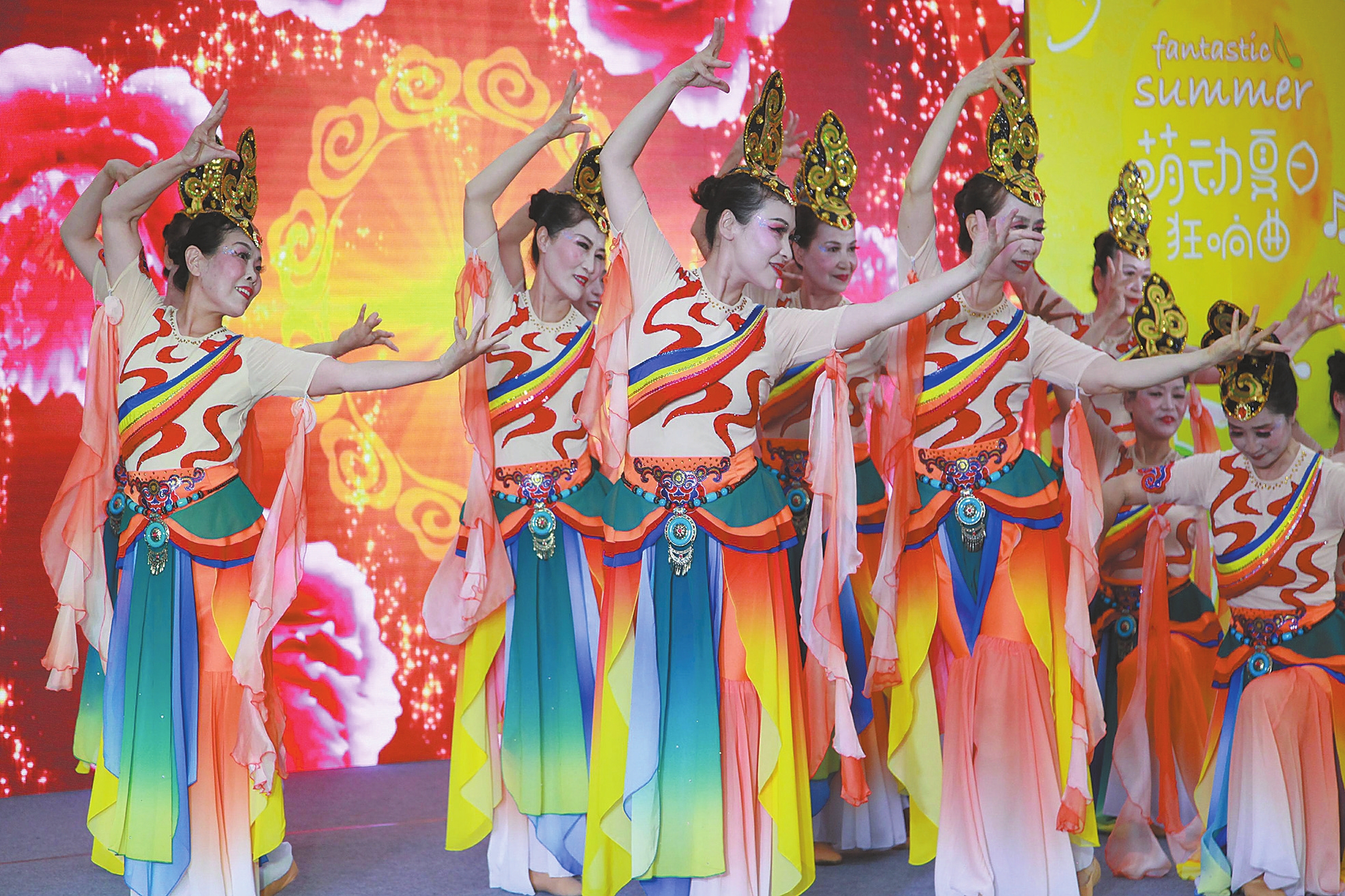 6月16日,市區萬達廣場,參賽代表隊正在表演舞蹈《一夢敦煌》。當晚,由許昌報業傳媒集團主辦的“廣杰地產杯”2019年許昌市廣場舞大賽進入決賽環節。據了解,經過半個月的角逐,60支參賽隊中有17支代表隊進入決賽,金葉舞蹈隊表演的《高粱熟了》獲得一等獎。這些代表隊在舞臺上以舞競技,充滿自信與活力,盡展廣場舞的魅力,為廣大市民送上了一道歡樂的文化大餐。 本報記者 喬利峰 攝