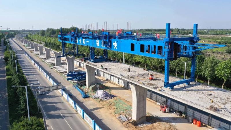 7月2日拍攝的鄭許市域鐵路許昌段高架區(qū)間的架梁施工現(xiàn)場。近日,鄭許市域鐵路許昌段施工人員冒高溫加緊施工趕進(jìn)度。目前,線路上橋梁工程筑基、承臺、墩柱、節(jié)段梁架設(shè)及現(xiàn)澆梁澆筑等工作正在有序進(jìn)行。鄭許市域鐵路建設(shè)項(xiàng)目是我市首條城市軌道交通骨干線,是推動鄭許真正一體化的標(biāo)志性工程。中鐵十六局集團(tuán)負(fù)責(zé)承建的鄭許市域鐵路(許昌段)項(xiàng)目,全長33.7公里,沿途設(shè)站11座,工程設(shè)計(jì)時速120公里,計(jì)劃2020年12月6日通車運(yùn)營。記者 牛書培 攝