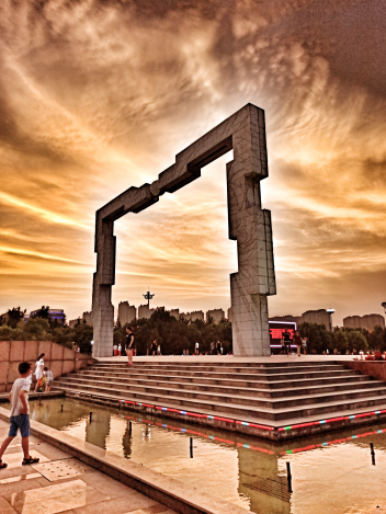 換個角度按下快門,許都公園里的智慧門成為天空最壯麗的點綴。