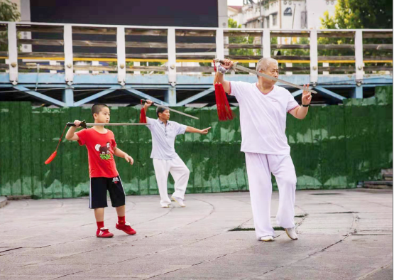 游園里,晨練的市民舞動寶劍,英姿颯爽忙健身。