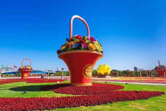 鄢陵花博園大廣場上有4個巨大的花籃,花籃里的各種花卉寓意民族大團結。《祝福祖國》畫面喜慶歡快,讓人們感受到了祖國的繁榮昌盛。