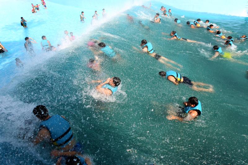 連日來,我市持續(xù)高溫,市內(nèi)各大游泳場館、水上樂園等迎來了客流高峰,許多市民選擇在泳池中消暑。圖為 8月1日,市民在瑞貝卡水世界“海嘯沖浪池”中戲水納涼。