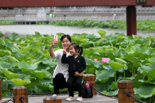 8月10日,一對(duì)母女在市區(qū)南護(hù)城河望仙橋附近拍照留念。記者 牛書培 攝