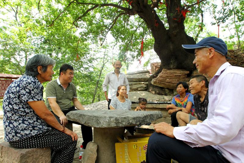 8月23日,郝占濤(左二)與村民在大橿樹下聊天兒。 許昌報業全媒體記者 牛書培 攝