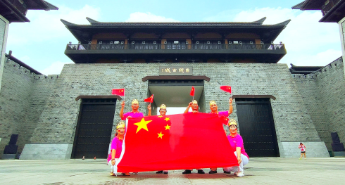 中秋節臨近,秋天的色彩更加濃郁。你看,落日余暉為蓮城大地穿上了金色的外衣,枝頭的果實散發著陣陣清香,在花叢間飛舞的蝴蝶仍是那么美麗……國慶節即將到來,市區的幾位老年人展開國旗,在曹魏古城南大門前拍照留念,祝福我們的國家更加繁榮昌盛。