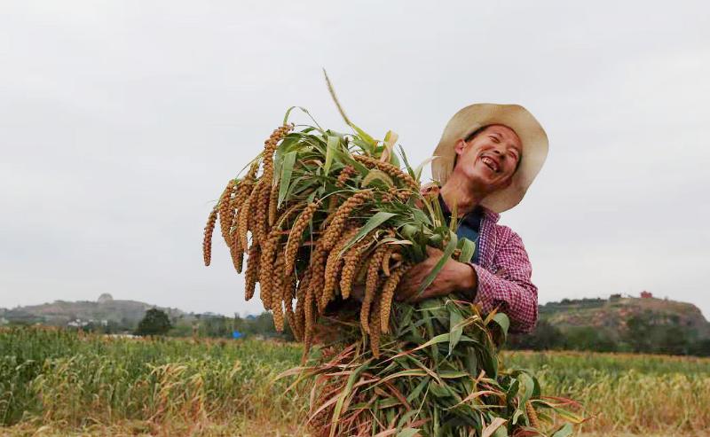 9月16日,禹州市無梁鎮大木廠村七組村民任丙偉在收割3畝多地的谷子,臉上露出開心的笑容。 大木廠村位居山崗地區。全村227戶940口人,有2300畝山崗地,是省級深度貧困村。去年以來,駐村工作隊指導該村因地制宜調整種植結構,試種良種谷子成功,農民收益大幅度提高,今年全村大面積種植谷子再獲豐收。