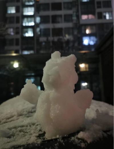 1月7日清晨,天空時而下起小雨,時而飄起雪花,時而下起雨夾雪,1月6日晚上那種大片的雪花沒有再現(xiàn)。可是,這又有什么關(guān)系?那用雪堆起來的可愛小熊、那些美麗的雪景照片定格了雪夜的美好記憶。
