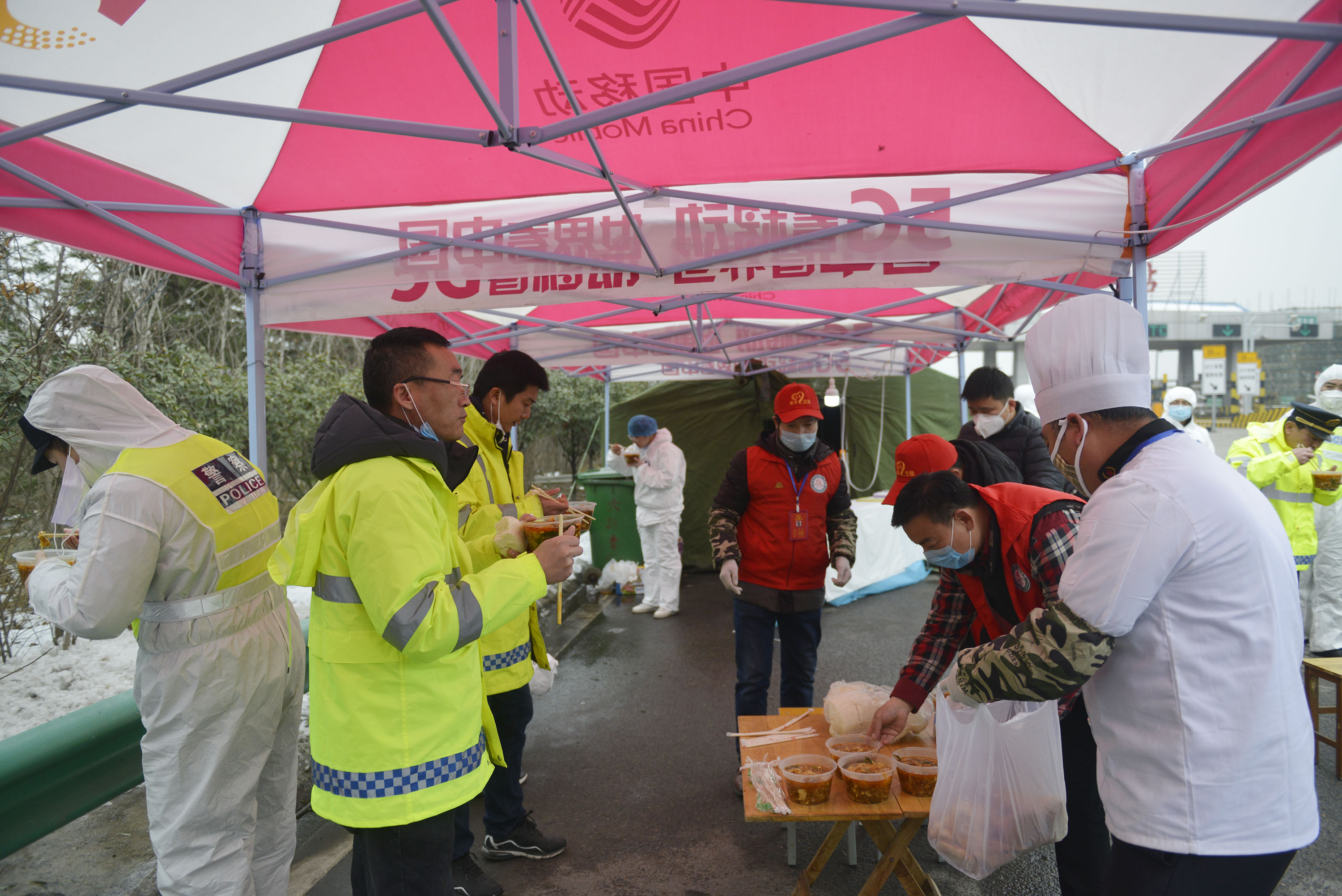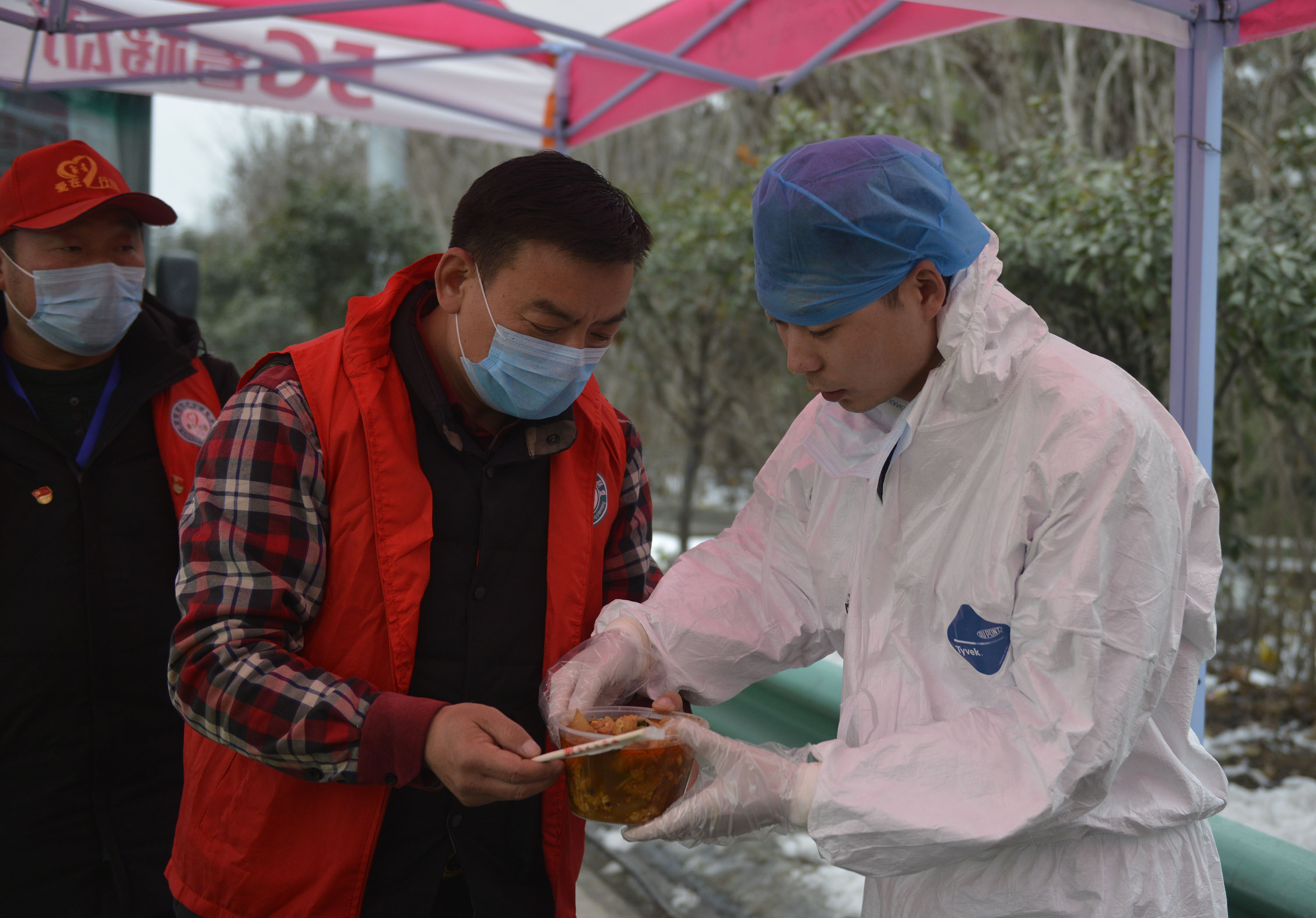 志愿者為疫情防控站工作人員送去熱騰騰的飯菜。