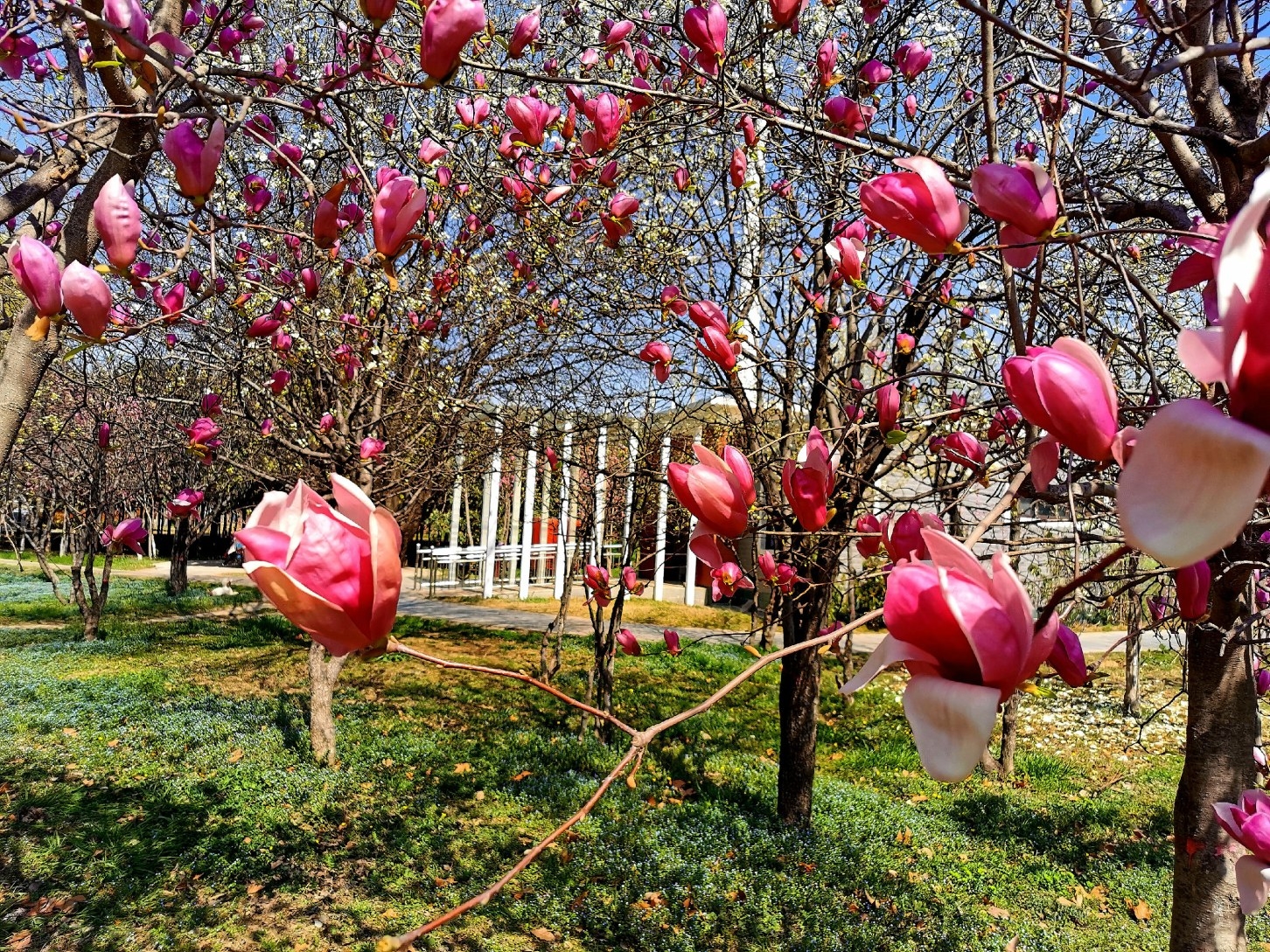 清潩河游園里的紅玉蘭花開滿枝。