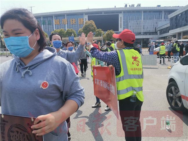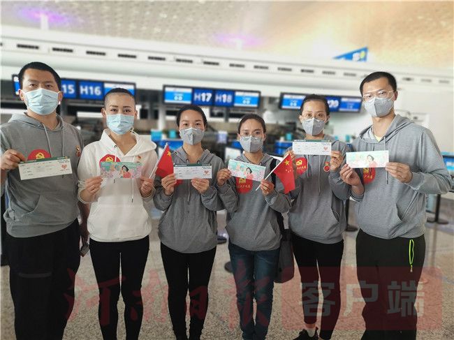 在機場出發大廳門口,熱鬧非凡,當地志愿者身著紅衣,舉著印有“你們是新時代最可愛的人,武漢人民永遠銘記您”的橫幅,并豎起大拇指點贊醫護人員。