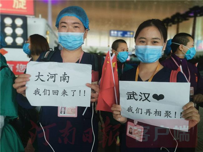 上午,在河南省第五批支援湖北醫療隊駐地酒店廣場,歡聲笑語,醫護人員們紛紛合影留念。“武漢,再見!”“我們要回家了!”“今日離別,期待我們在黃鶴樓相見!”“別了長江!黃河,我來了!”“兒子,媽媽回家想抱抱你!”……醫護人員說出自己的離別之話,有的說著淚水已悄然而出。