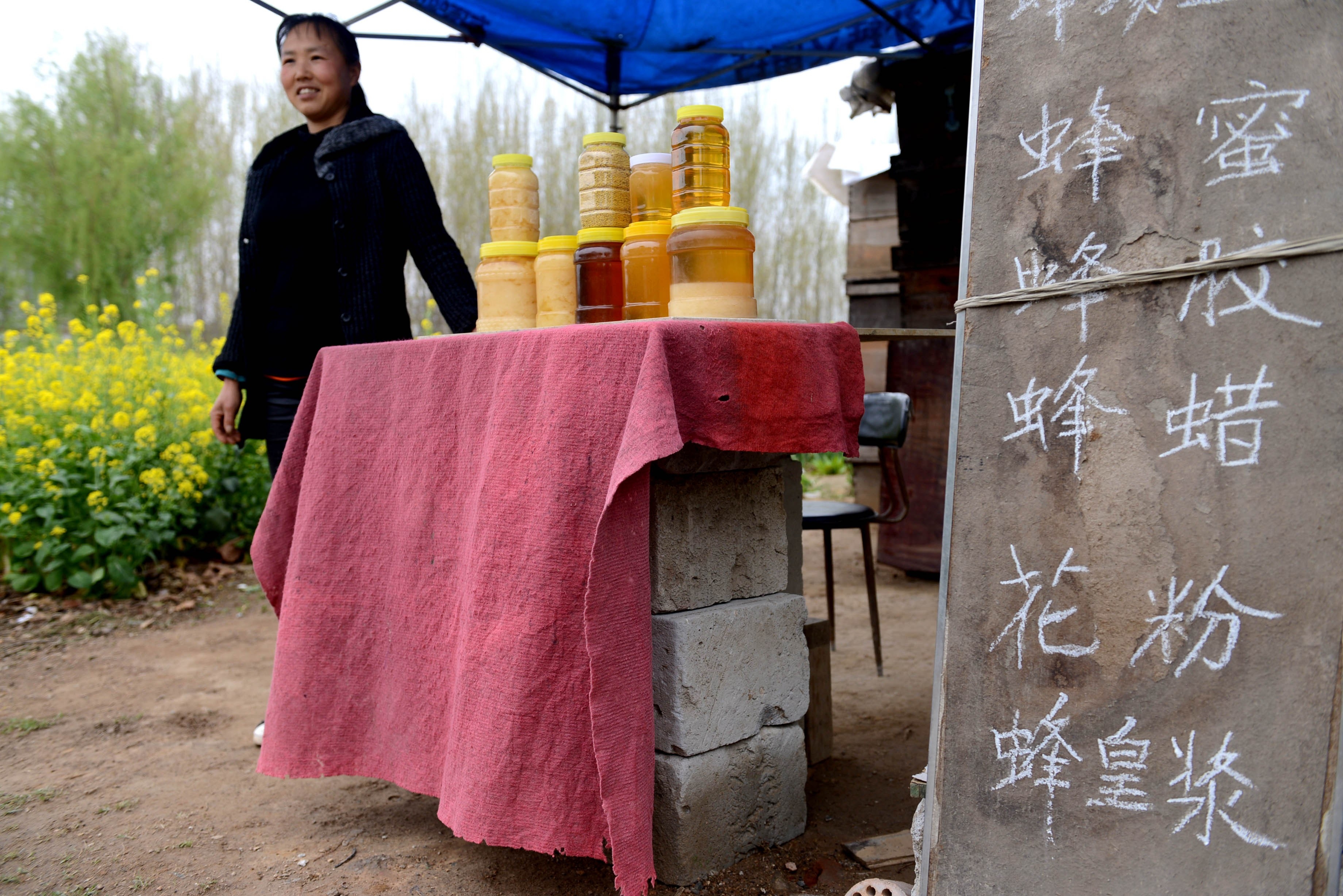 鄭廣秀在售賣自家產(chǎn)的蜂蜜。 記者 牛志勇 攝