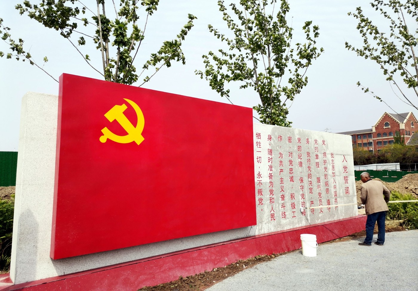 4月20日,許昌市區天寶路西段黨建公園,一位工作人員正在擦新建的黨旗墻。據記者了解,為方便各級黨組織在這里組織開展入黨宣誓活動,黨建公園在北部小廣場建設了一面黨旗墻,旁邊有入黨誓詞。 記者 黃增瑞 攝