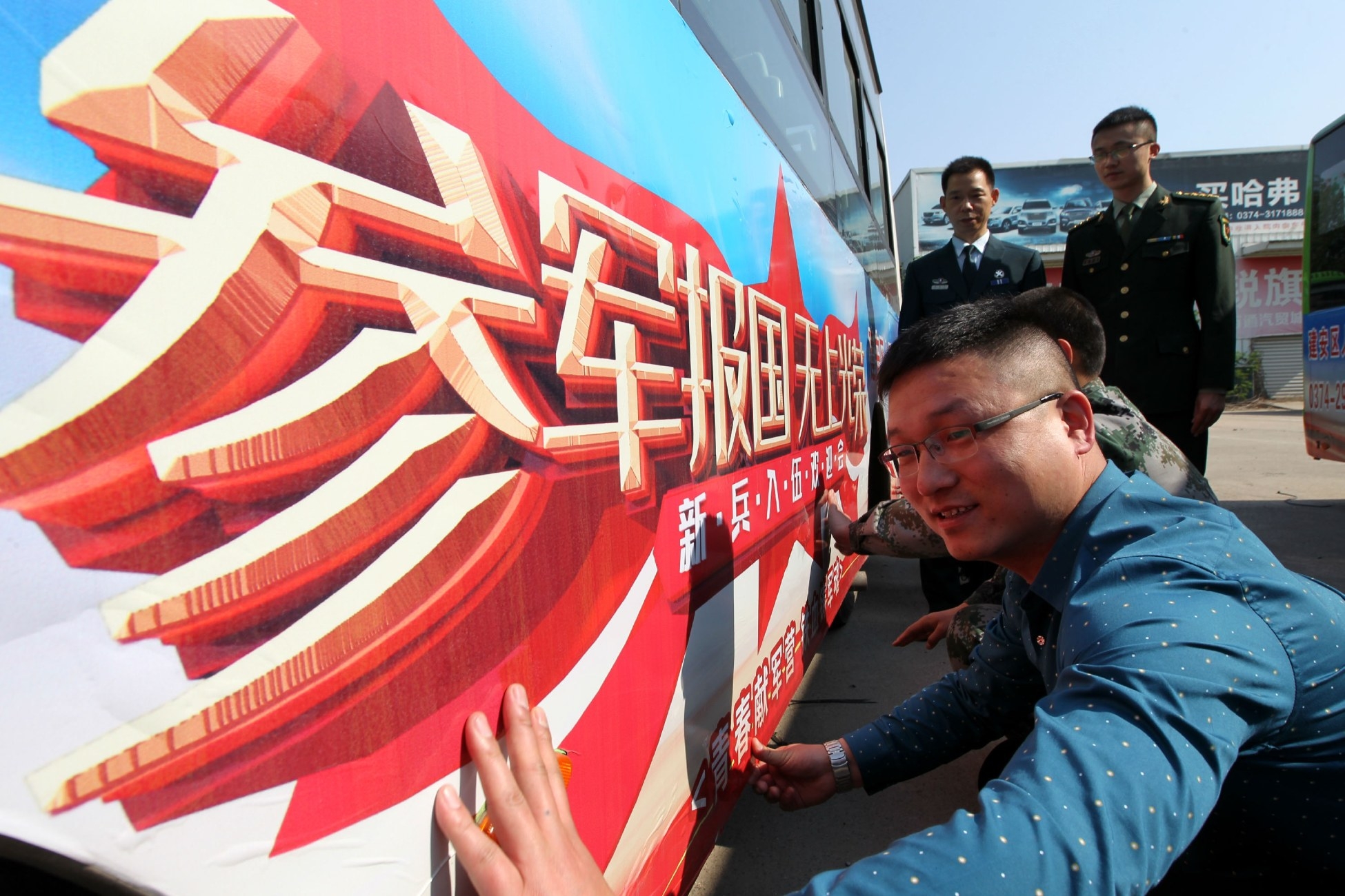 4月29日,工作人員在公交車上張貼征兵宣傳招貼畫。當日,建安區在該區公交公司舉行國防教育暨征兵宣傳公交流媒體發布啟動儀式。據悉,自今年征兵工作啟動以來,建安區人武部精心搜集整理了一些征兵宣傳招貼畫,張貼在轄區城鄉公交車上,讓乘客及時了解今年的征兵信息,積極營造依法征兵的濃厚氛圍。記者 牛書培 攝