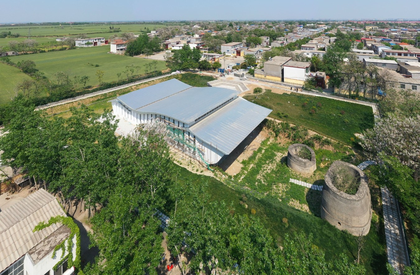 這是4月29日航拍的靈井“許昌人”遺址保護利用設施建設項目。該項目位于建安區靈井鎮,既是遺址核心區的保護展示工程,又是考古遺址公園的重要節點。據了解,靈井“許昌人”遺址保護利用設施建設項目建筑設計參考出土文物“靈鳥”的形象特征。三個曲線屋頂象征三只“靈鳥”,暗示“三泉”。該項目總建筑面積1080平方米,其中遺址保護展示面積880平方米、管理服務用房面積200平方米。記者 牛書培 攝