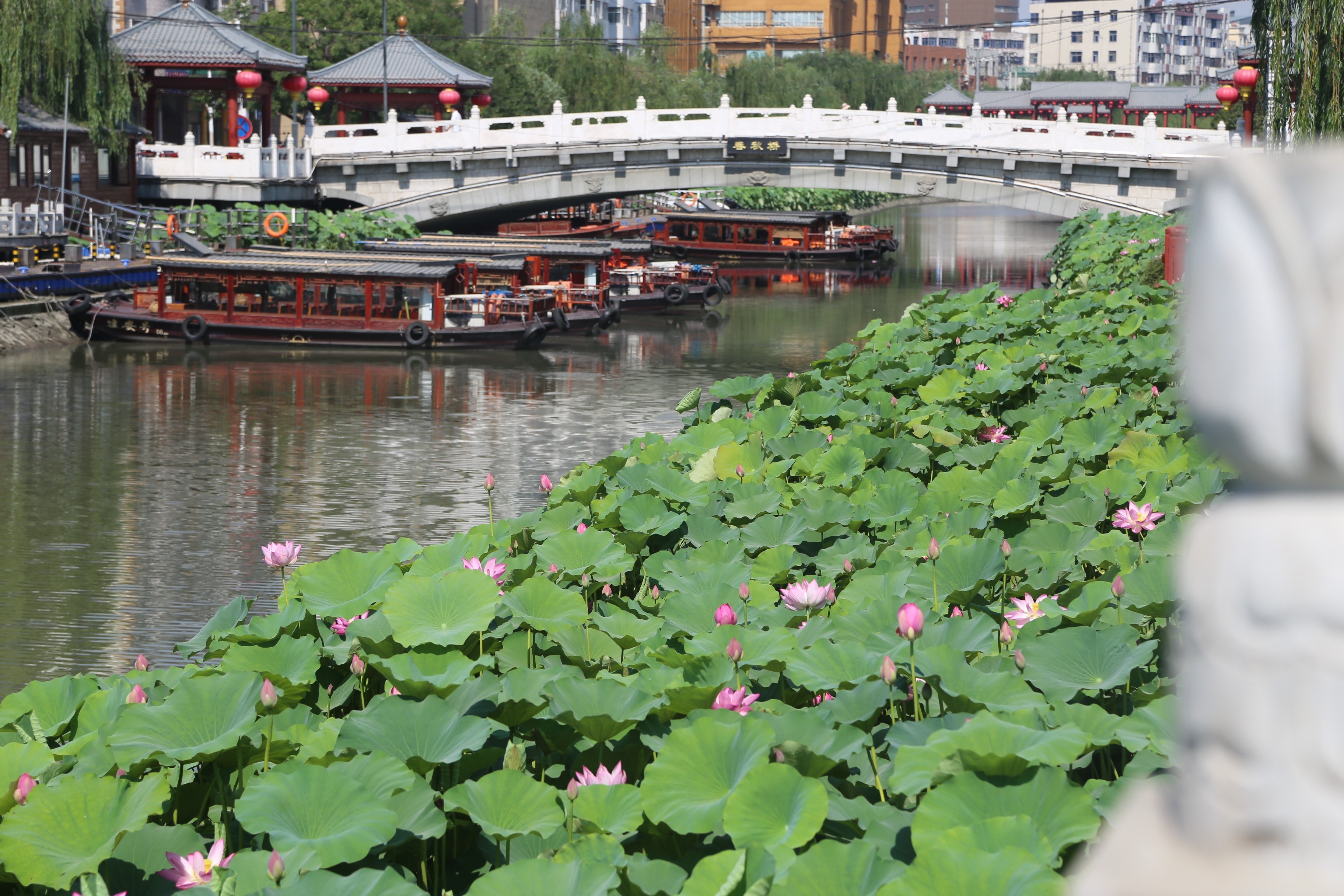 與瑞貝卡大酒店相呼應的望仙橋,是護城河上觀荷的一處絕佳位置。站在橋上可向東、向西遠眺,除了行船的主航道之外,清澈的水面上鋪滿了碧翠欲滴的荷葉。綠葉叢中,一枝枝高挺的荷花亭亭玉立。風吹過,朵朵荷花扶風凌波。這里的荷花以粉色居多,也有白色的,散發著馥郁的香氣。
