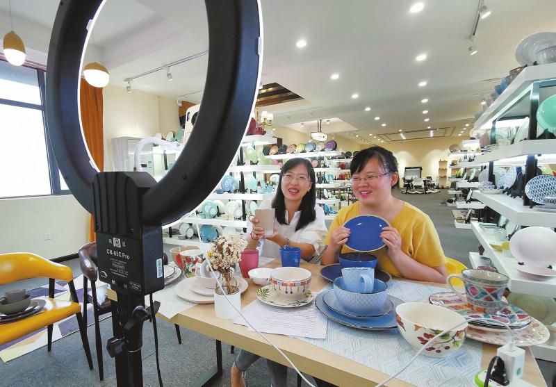 6月16日,許昌格羅科實業有限公司,兩名工作人員以網絡直播的方式在第127屆中國進出口商品交易會(簡稱“廣交會”)上進行日用瓷產品推介。在全球疫情沖擊下,“云”端廣交會給了全球采購商參與對接的機會,參展企業紛紛進行線上轉型,希望抓住新機遇,碰撞出更多新商機。 本報記者 喬利峰 攝