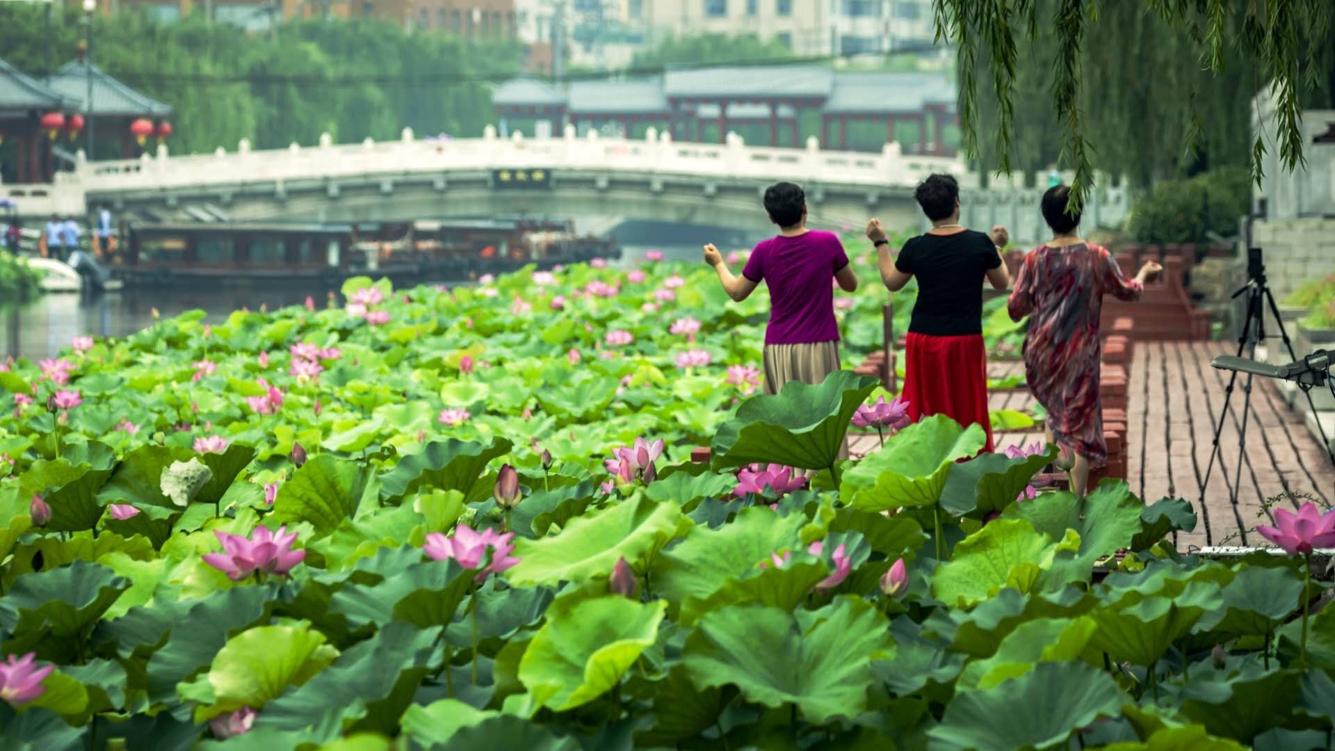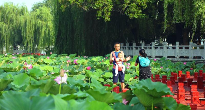 護(hù)城河畔,幾個市民跟著一池荷花翩翩起舞,陶醉在迷人的景色中。 晨報(bào)攝友 楊望祥 攝