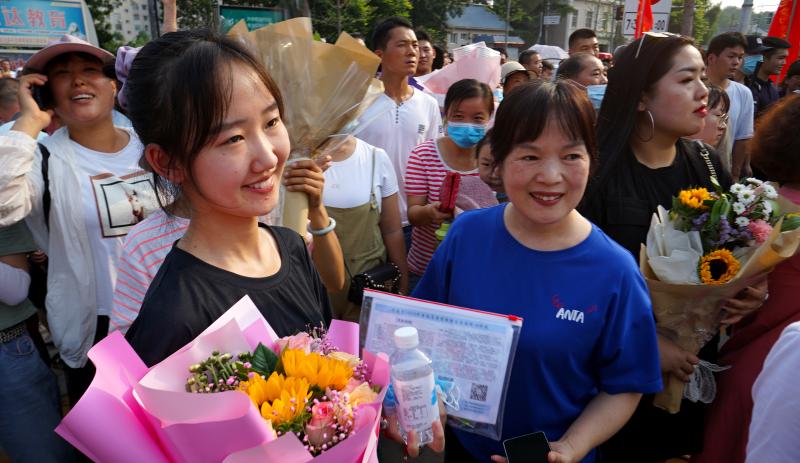 7月8日,在許昌高中建安大道校區(qū)考點,一位考生眼含熱淚接過母親送上的鮮花。當日下午,隨著最后一場考試的結束,2020年高考也終于畫上句號。不少家長等候在考點外,用鮮花、擁抱為考生送上溫馨的祝福。一位抱著鮮花的家長說:“如今是孩子學習生涯的關鍵時刻,想和其他家長一樣,送花鼓勵她、祝福她。”
