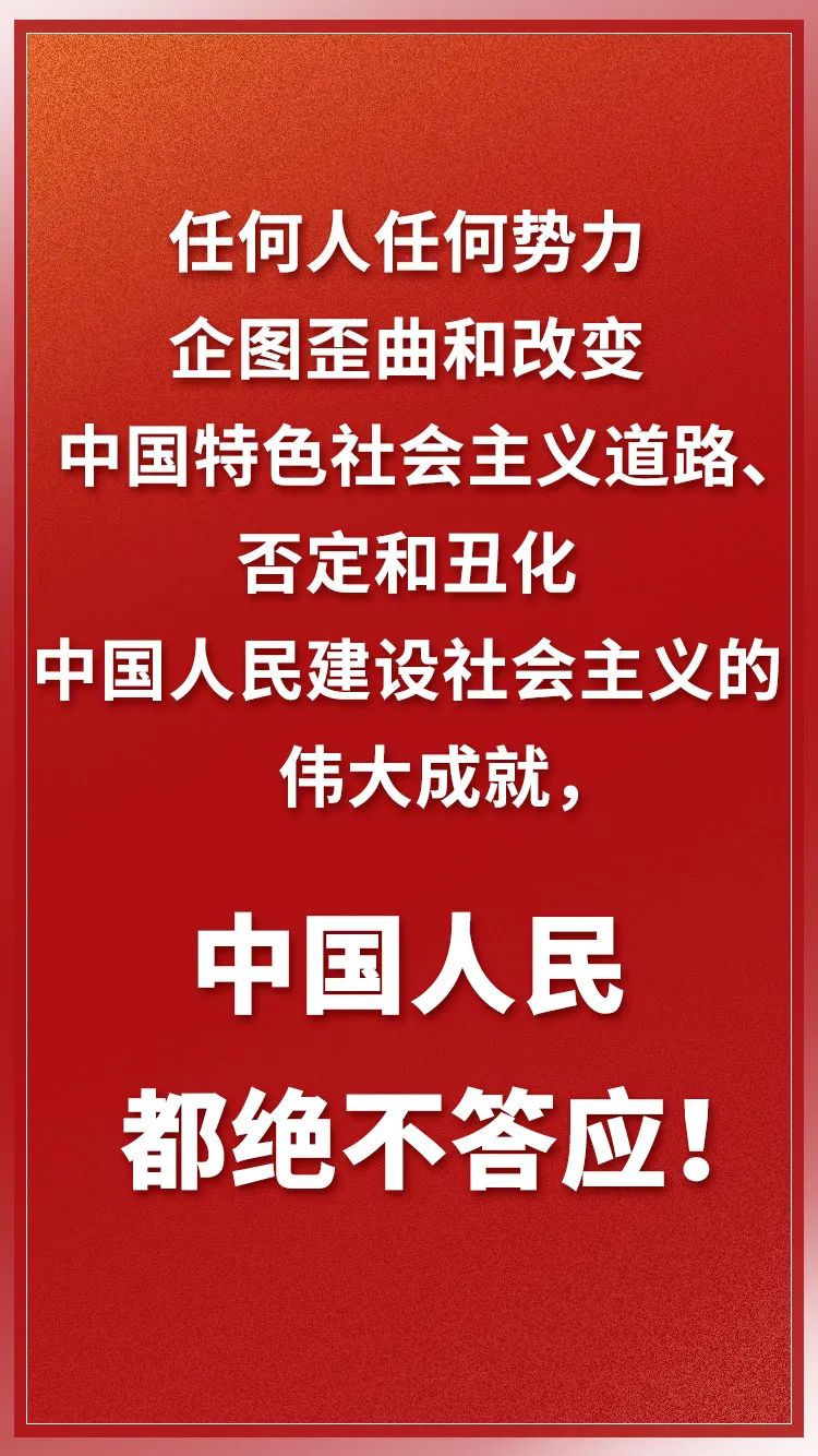 ——實現中華民族偉大復興,必須堅持走中國特色社會主義道路。道路問題直接關系黨和人民事業興衰成敗。中國特色社會主義道路是黨和人民歷經千辛萬苦、克服千難萬險取得的寶貴成果。中國特色社會主義道路,開拓于中國人民共同奮斗,扎根于中華大地,是給中國人民帶來幸福安寧的正確道路。無論遇到什么風浪,在堅持中國特色社會主義道路這個根本問題上都要一以貫之,決不因各種雜音噪音而改弦更張。隨著新時代堅持和發展中國特色社會主義的偉大實踐不斷向前,我們的道路必將越走越寬廣,我們的制度必將越來越成熟。任何人任何勢力企圖歪曲和改變中國特色社會主義道路、否定和丑化中國人民建設社會主義的偉大成就,中國人民都絕不答應!