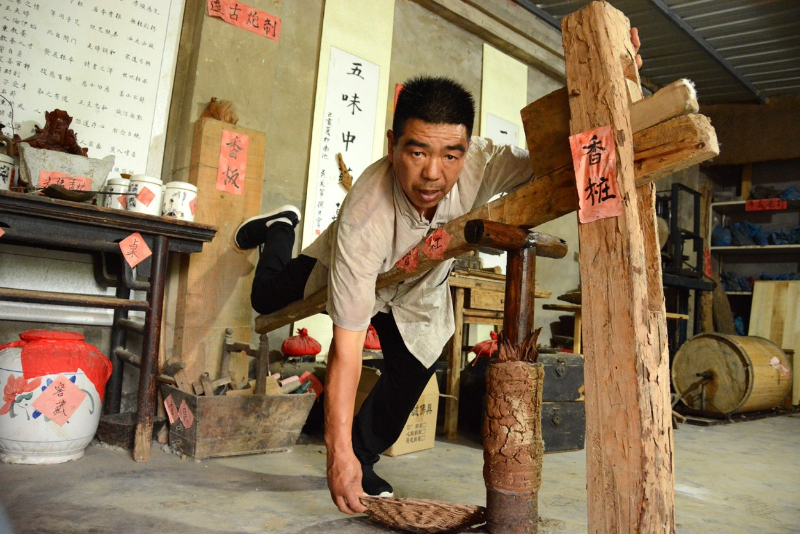 與灞陵橋景區一墻之隔的是張氏古法手工制香技藝傳承基地。在這里,記者見到了艾葉簍、香料桶、香板、香柱、香樁、香錘、香機等手工制香器具。