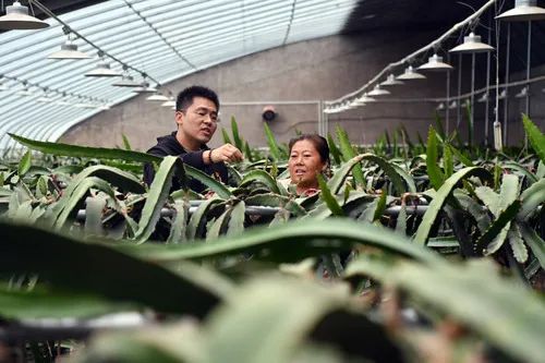 田昕(左)在馬橫嶺村的大棚內與承包戶田利華交流火龍果種植經驗(10月12日攝)。本報記者李嘉南攝