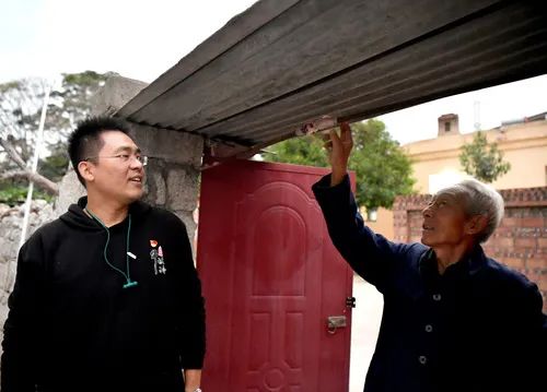 牛橫嶺村村民牛天保(右)將自家門框內的橫梁掰成拱形并用布條包住,以防田昕進門時碰到頭(10月12日攝)。本報記者李嘉南攝