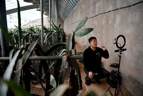 田昕在馬橫嶺村的大棚內直播介紹種植的仙人掌(10月12日攝)。本報記者李嘉南攝