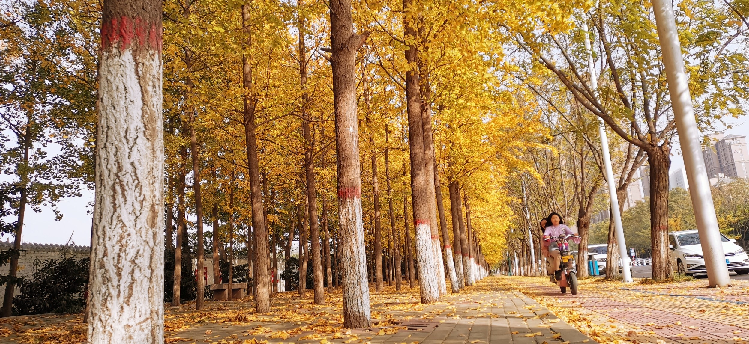 11月2日,市區陽光明媚,在新東街旁,銀杏葉似黃蝶飛舞,落到地上鋪成了金黃色的地毯。 記者 張大弓 攝