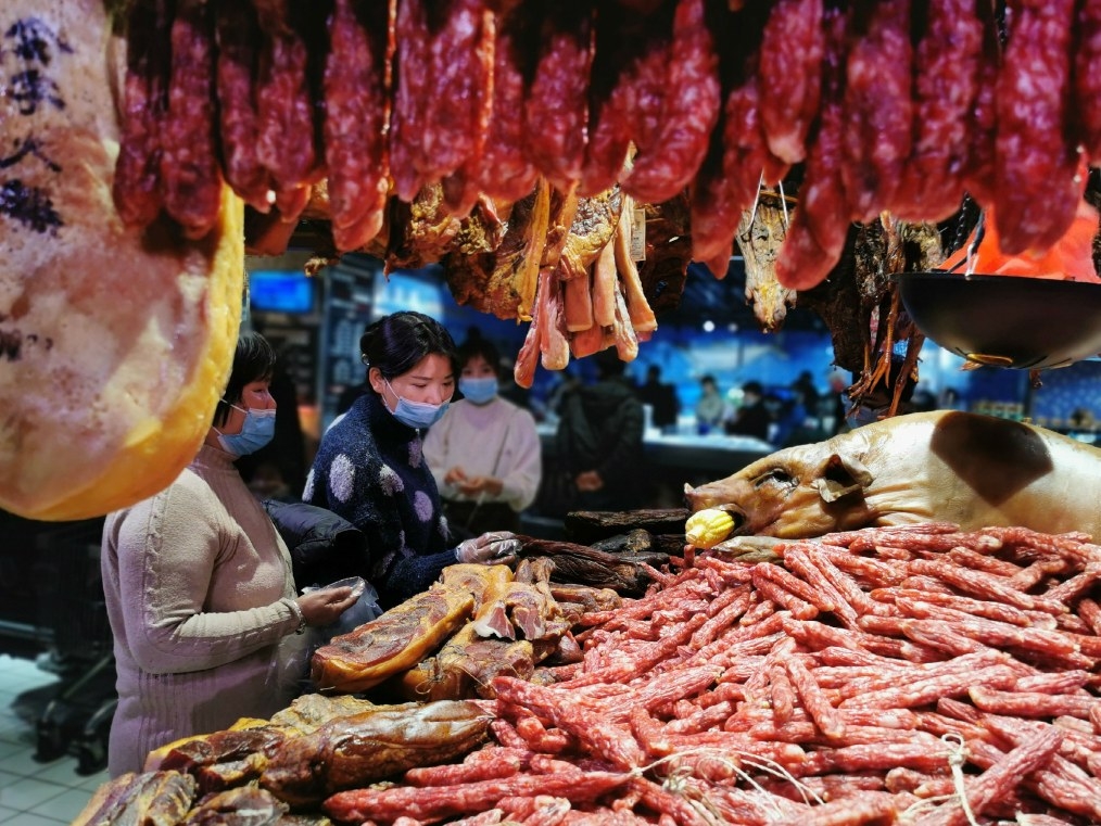 “買一塊臘肉吧,做年夜飯時配上辣椒、蒜苗炒一炒,非常美味。”“買幾根臘腸,切片蒸一蒸,味道非常好。”1月31日,在胖東來生活廣場臘味食品專柜前,很多市民一邊挑選臘腸、臘肉,一邊交流臘味食品的吃法。色澤紅亮的臘腸、臘肉等掛在高高的貨架上,讓人感受到了濃郁的節日氣息。