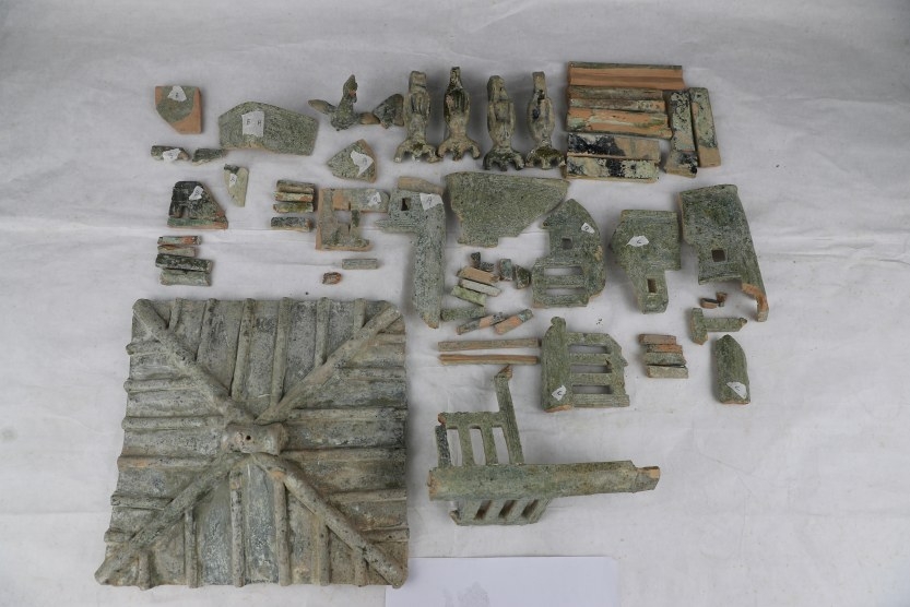 文物修復師在修復漢綠釉水榭。