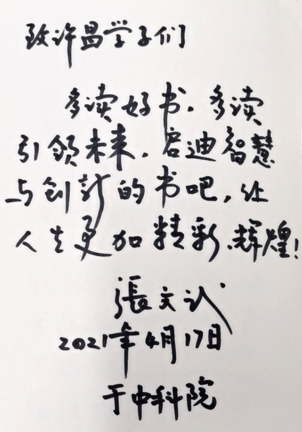 “多讀好書,多讀引領未來,啟迪智慧與創新的書吧,讓人生更加精彩,輝煌!”4月17日,遠在寧波的許昌籍科學家張文武為我市莘莘學子寫下殷殷寄語。
