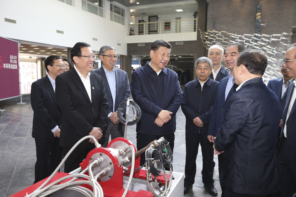↑2018年5月2日,習近平在北京大學金光生命科學大樓一層大廳認真聽取關于學校學科建設、人才隊伍建設、科研創新能力提升等情況介紹。