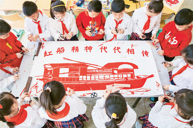 圖為內蒙古呼和浩特市恒昌店巷小學開展“紅船精神代代相傳”主題教育活動,通過制作紅船剪紙作品、講述紅船故事等豐富多彩的形式,教育孩子們知史愛黨、知史愛國。 人民圖片 丁根厚/攝