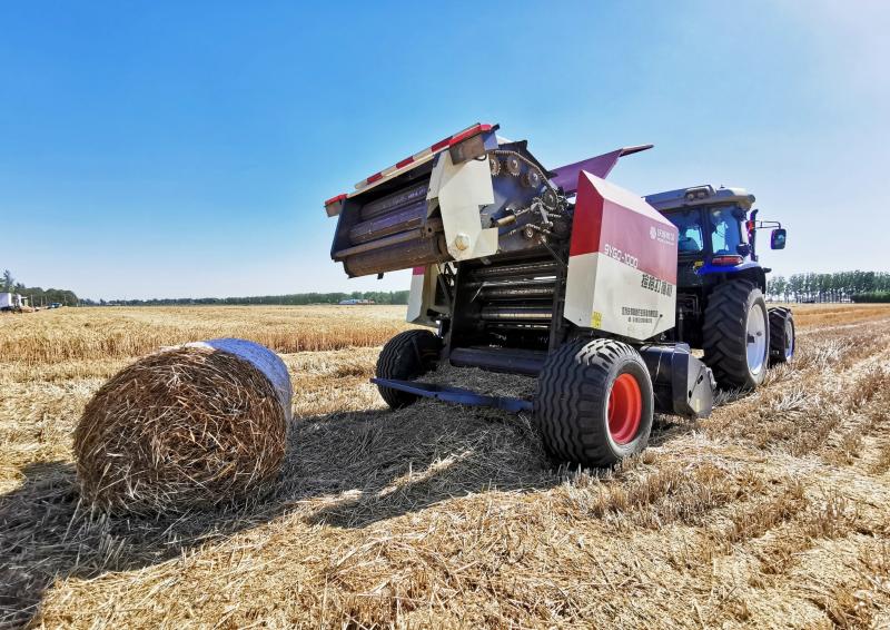 6月8日,在建安區(qū)陳曹鄉(xiāng)高標(biāo)準(zhǔn)農(nóng)田,一臺打捆機(jī)正在進(jìn)行秸稈打捆作業(yè)。該鄉(xiāng)農(nóng)機(jī)合作社與農(nóng)民簽訂小麥?zhǔn)崭钭鳂I(yè)協(xié)議,提供小麥?zhǔn)崭睢⒔斩挻蚶σ粭l龍服務(wù),有效提高秸稈的綜合利用率。 本報記者 喬利峰 攝