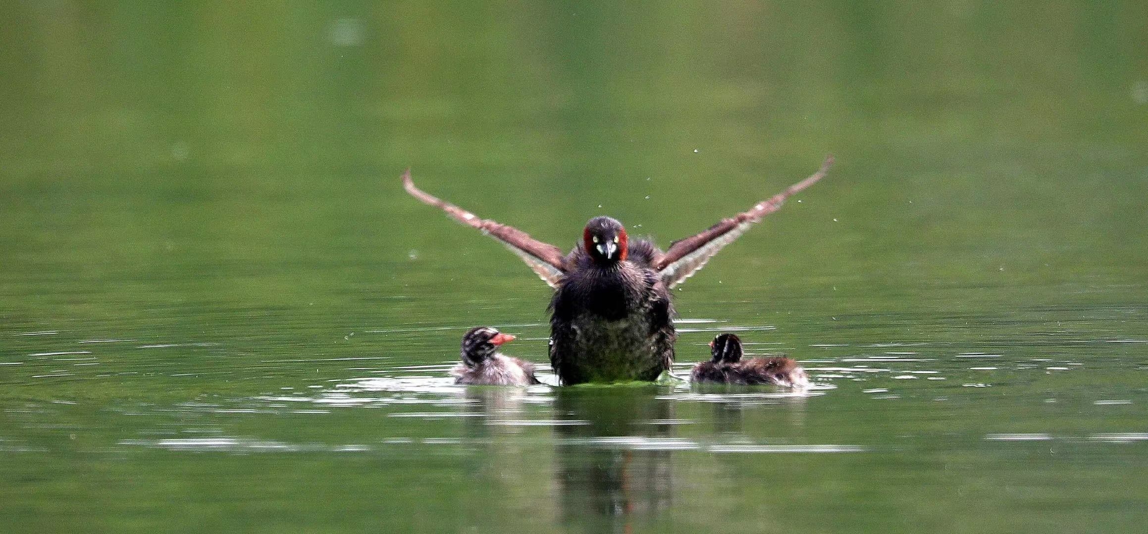 在市區(qū)芙蓉湖,一只貔鵜帶著兩只小貔鵜在湖中嬉戲。突然,貔鵜看見前方水面上蕩起層層波紋,不自覺地張開翅膀保護(hù)小貔鵜。 晨報(bào)攝友 高文勝 攝
