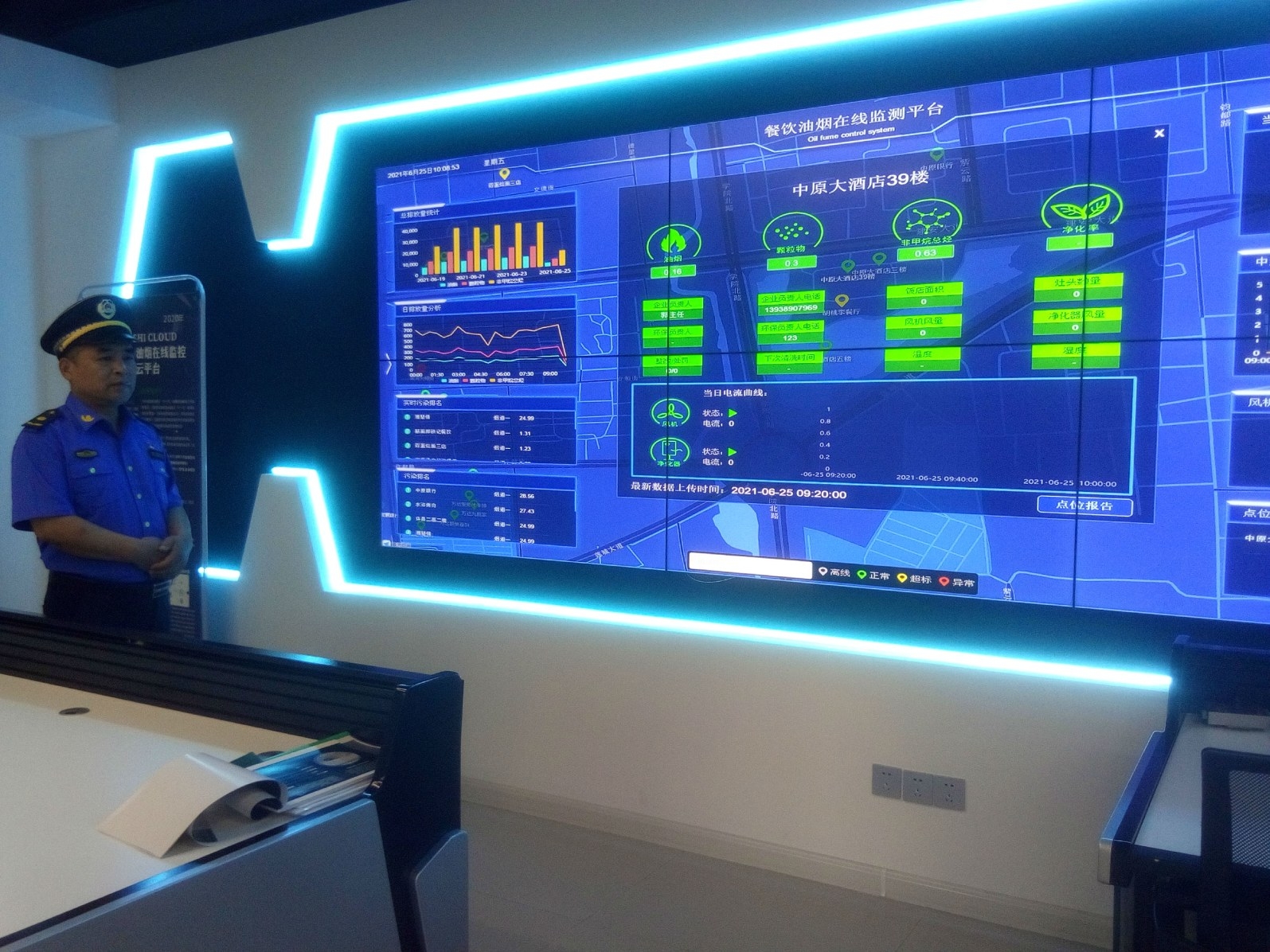 該中心的液晶大屏幕實時顯示各個餐飲企業的油煙排放情況。同時,綠色、紅色、黃色等不同的顏色標記監測點油煙凈化器的運行狀況。
