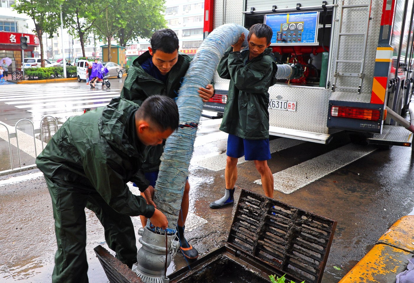 7月21日,市消防救援支隊八一路消防站救援人員對八一路周邊小區進行排澇。 本報記者 譚宜姝 攝