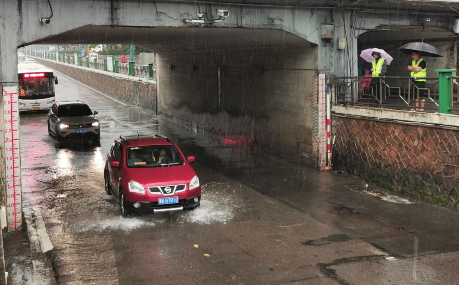 7月21日,防汛工作人員在市區中立交橋密切關注積水情況。本報記者 喬利峰 攝