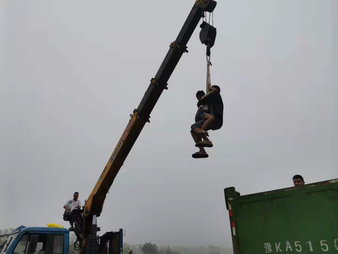 7月21日下午,在長葛市大周鎮夏張村,救援人員使用吊車轉移被困群眾。 黃增瑞 攝