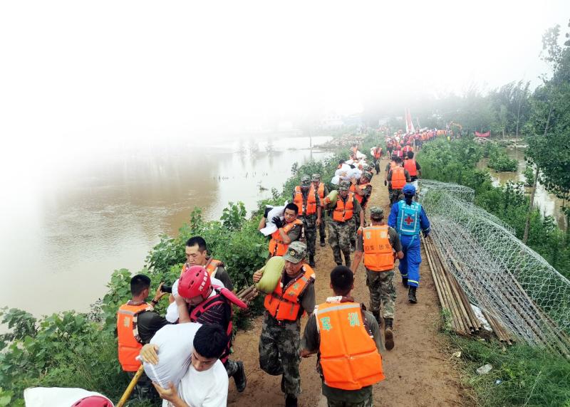 7月22日,在長葛市古橋鎮雙洎河橋附近,駐許某部官兵和許昌民間應急救援隊隊員一起扛沙袋堵決口。