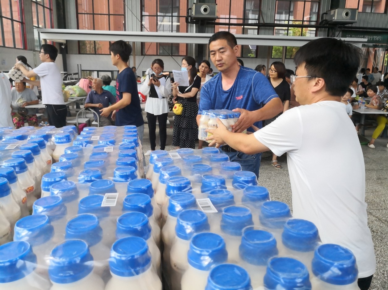 7月22日,在鄢陵縣外國語中學防汛安置點,愛心企業和人士送來各種物資。